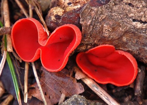 博物館の前庭の山際で、赤い色をした変わった形のキノコを見つけました。ネット上で同じ画像を探して名前を調べてみたら、ベニチャワンタケモドキって言うんだそうです。