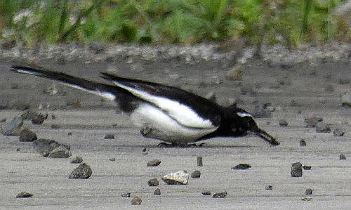 脚を折りたたむようにして体を低くし、顔を前にのばして、エイッ。うまくごちそうをゲットできました。 下部リバーサイドパークのヘリポートでとらえた、瞬間です。