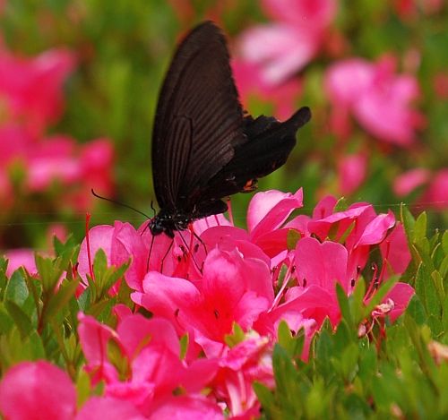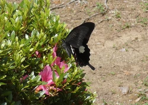 サツキツツジの花には、いろんな虫がやってきますが、今度のは、黒いアゲハチョウの仲間です。吸蜜管をのばして花の蜜を求めているようです。 花から花へと移動しながらの途中、あやしげですがフライト中の状態を撮ることができました(偶然に)。 短い移動中は、ちゃんと吸蜜管をまとめないんだ! ちょっと驚き。後ろ翅に白い筋が見られるので、クロアゲハの雄とみられましたが、どうでしょうか。