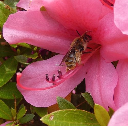 サツキツツジの花の中に、飛び込むようにやってきました。ニホンミツバチかとも思われましたが、違うかなとも・・・。これだけのカットなので、何ともいえません。ハナバチの仲間としておきます。