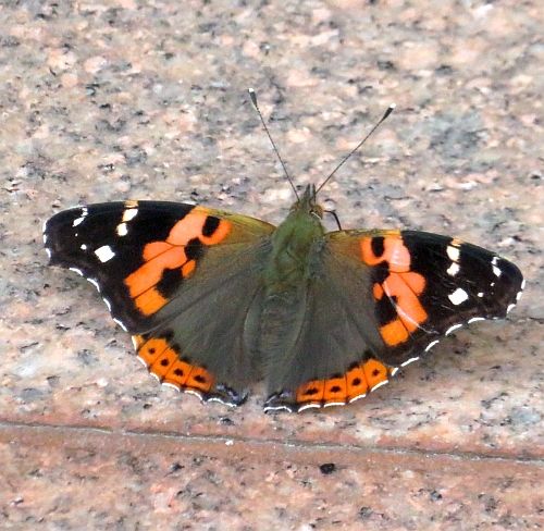 先日、博物館の正面玄関前に、アカタテハがおいでになりました。玄関前のたたきの上にとまり、翅を閉じたり開いたり・・・。何してるんだろうな。博物館のようすみかな。 ひょっとしたら、と思い、違う角度で見てみたら、なんと吸蜜管をのばして、たたきの表面をさぐっているではありませんか。 梅雨時で、この日は雨は降らなかったのですが、その前日にけっこうな雨量があり、そうした加減か、たたきの上のところどころに水分があったみたいです。そうした、わずかな量のミネラルウォーターも見逃さず、細長いお口をのばして求めているように見うけられました。 チョウも栄養補給がだいじです。