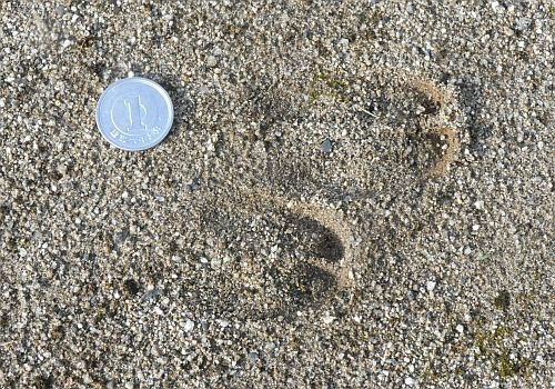下部リバーサイドパークの中のボールゲーム用のコートで、シカの足跡を見ました。シカの足跡とか、黒い豆状の落としものとか、ありふれていて取り立てて話題にすることは、あまりないのですが、今回の足跡とても小さいので、ちょっと気になりました。子どものシカだと思われました。その姿が目に浮かびます。
