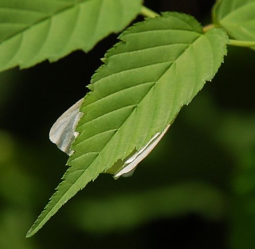 ヤマブキの葉の裏に、じょうずに隠れたつもり・・・みたい。でも、きっと隠れたという意識はないのでしょうね。 葉の裏側をのぞき込んでみました。 すぐに飛び立って、また別な葉の裏にとまりました。一見して、ガの仲間であることはすぐにわかりましたが、どんなガなのか、気になりました。 そういえば、元気よく飛ぶ姿は、シロチョウ科のモンシロチョウのようにも見えるのです。それが、今の時期、たくさん見られます。 ガの場合、種類がとても多く、名前を突きとめるのがとてもたいへんですが、シロチョウのように飛ぶこと、今の時期に多く見られること、などをキーワードとして検索してみたところ、キアシドクガと判明しました。 ドクガ、すなわち毒のあるガの仲間ですが、キアシドクガには毒はいまのところ確認されていないようです。それと、キアシ―のことですが、文字通り、脚が黄色だそうです。とくにメスの場合は全部の脚が、オスは前の脚のみが黄色ということで、そうした情報を参照すると、今回のキアシドクガは、オスということになるみたいです。