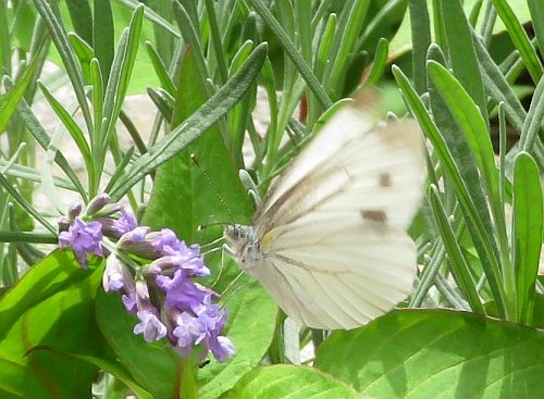 モンシロチョウに似ているけど、同じシロチョウ科のスジグロシロチョウだと気付きました。 もう少し近寄ってみました。これならよくわかりますね。 ラベンダーは、博物館の入り口周辺におかれたプランターで栽培されているものなのですが、このプランターでは、以前からのケイトウが生えてきていて、そのせいで背景は何だか、ごちゃごちゃしています。