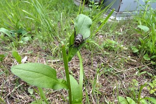 何気なく、少し前の撮影画像をながめていた時、アジサイの花にうもれるようにしていた時から数日前に、セマダラコガネのこんな写真を撮っていたことに気付きました。 下部リバーサイドパークの最下流部で、ヒメジョオンの葉の上にいたのを見ていたのでした。その時は、何かの甲虫くらいで、あまり関心が深まらなかったのかな。いいかげんな観察者だということがバレバレ・・・。