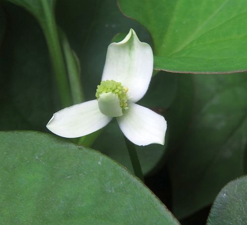 遠目に見て、あれっ、三つ花? と。 それで、近寄って見てみたら、それはまだ若いドクダミの花で、4枚面の総苞片(白い花びらのように見えるの)が、まだ開ききっていないものであることがわかりました。