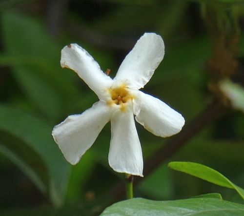 前回のシャクガを見た場所の続きで、草むらの中に白い花を見つけました。何の花だろう。 シダの仲間や、草本類に埋もれるようにして生えているのでしたが、花の特徴からバイカウツギだと考えられました。こんな小さな木でも、にぎやかに花を咲かせていて、ちょっとすごいなと思われました。