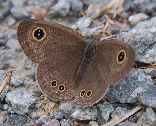 下部リバーサイドパークの中のヘリポートの脇で、ヒメウラナミジャノメが地表に降りたち、翅をゆっくりと開閉するようすが見られました。こちらは翅を開いたところで、翅の表面の模様が確認できます。丸い模様は、ジャノメ(蛇の目)としてとらえられていて、こうした模様は、タテハチョウ科の一部(以前はジャノメチョウと呼ばれていた)に多く見られるものです。 こちらは翅を閉じた場面、翅の裏側は、前翅、後ろ翅ともに波の地模様になっています。そしてやや小型なので「ヒメ」がつきます。 ヒメウラナミジャノメとは、タテハチョウ科の一種で、やや小型の、ジャノメ模様をもつもので、翅の裏側が波模様のチョウということになりますね。