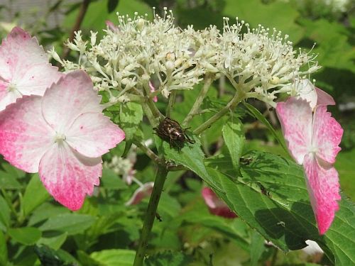 博物館の通用口近くに見られるガクアジサイです。ここのは、ちょっとよい感じの赤っぽい色をしています。おや・・・、あそこに何かいるなぁ。 甲虫の仲間で、この場面では、アジサイについた甘露を吸っているみたいでした。いったい何という虫なんでしょうか。