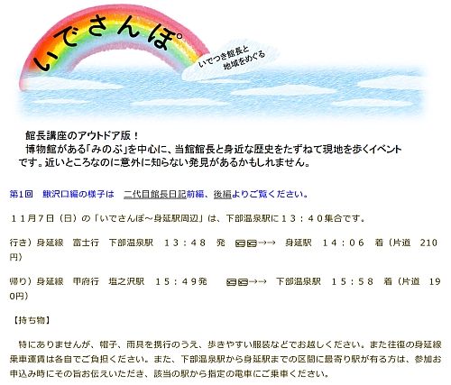 明日(9月26日)のイベントのことも出ていますね。明日は、身延線電車にのっての鰍沢河岸跡や富士橋を見学する内容、詳細は博物館のホームページ見てくださいね。