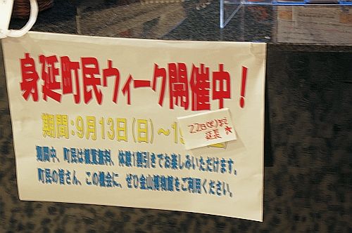 今年は思いのほか好評をいただいた身延町民ウィークですが、これについて博物館の受付カウンターに張り出されているポスターに、小さな貼り紙が……。 この連休中までだいじょうぶだそうです。身延町民の皆さま、この機会に皆さまの湯之奥金山博物館をご利用くださいませ。
