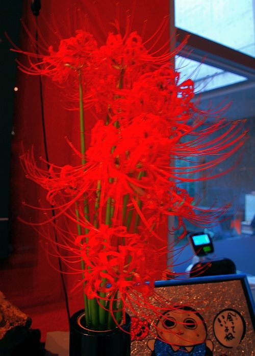 カメラのオートフォーカスが、迷ってしまったみたい。露出計もうまく働かず。でも、それがまたいい味かな。 博物館の受付を飾るヒガンバナの花、すごいです。