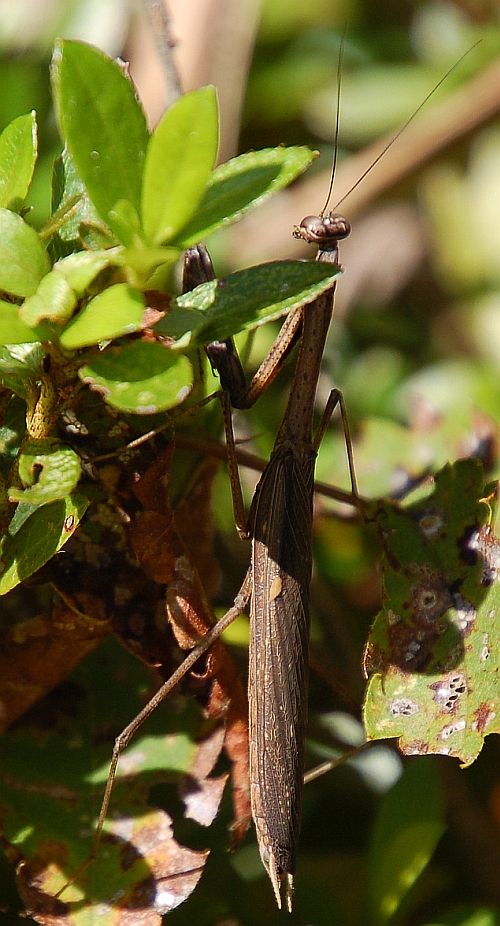 カマキリ科カマキリ亜科のカマキリたちの中で、一番小さなコカマキリ。先日、下部リバーサイドパークの下部川寄りの植え込みの中で見つけました。 失礼ながら、お腹の先端のようすを拝見。ここに性差があらわれるとの情報に接し、このように、2つの大きな突起(尾毛とか尾角とかの名がある感覚器官)の間に、小さな突起があって、お尻の後ろに4つの突起が見られるのは、オスだというのです。 「ナンダヨ オシリバッカリ ミテルンジャねえよ!」といわれたような気がしました。