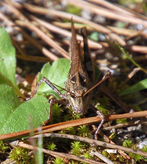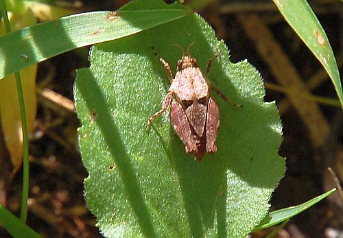 少し前の日差しが届いていた日に、下部リバーサイドパークの中の草地で小さなちいさなバッタの仲間を目にしました。草の葉の上でしたが、体がとても小さく、葉が広々見えました。
