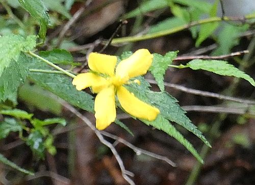 下部リバーサイドパークの最下流部で、雨にぬれたヤマブキの花が見られました。もう9月の終わり近くという時期なんですが、まだヤマブキの花が見られるなんて・・・。そういえば、・・・・・。(撮影:2020年9月19日 富士市広見公園) 1週間ほど前に、とある勉強会で富士市のかぐや姫ミュージアムを訪れたとき、敷地続きの市立の広見公園で、やはりヤマブキの花が咲いているのをみたことを思い出しました。八重咲きのヤマブキの花、けっこうたくさん見られ、ちょっとびっくりしました。(撮影: 同前 ) 八重咲きほど多くはなかったですが、一重咲きのヤマブキも見られましたよ。