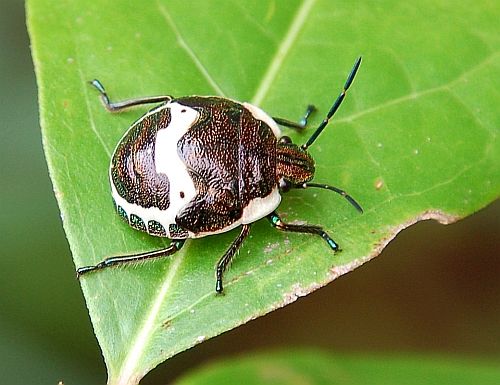 サザンカの葉の上が舞台というと、こちら様を外すことはできませんね。アカスジキンカメムシの5齢幼虫です。全体的に光沢があって、特にこの角度では、足の部分を中心に、緑色の輝きが見られ、カッコイイです。
