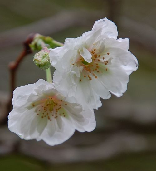 博物館の正面玄関前から、下部リバーサイドパークを見ています。お昼前のことでした。まだ雨は降っておらず・・・。おや、ジュウガツザクラ(画面の中央)の木の枝先に、何か白いものが・・・。ひょっとすると・・・。 今度は300mmで望遠。花が咲いている・・・。ほんとかな。 木の近くまでいって確認したところ、もう、数輪の花が咲きほころんでいました。確実に「開花宣言」です。いつもは、10月の5日とか、6日のことなんですけど、今年はばかに早い開花となりました。どうしたんだろう・・・。 うれしいやら、何か心配になるやら。