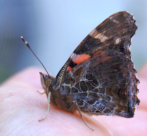 アカタテハが、博物館の中にお見えになり、何かと不都合だろうと、捕虫網のお世話になりました。で、網の中から、翅をつまんで館外に強制退去のお沙汰となったのですが、その執行役を引き受けました。 無事に館外までしょっぴいてゆき、最後の別れを告げるとき、人相書きにでもと、写真をとりましたのが、これです。 1点目の写真を撮った後、放免しようとしたのですが、なかなか手乗りアカタテハしていて、飛んでいきませんでした。 ずっとお付き合いしている訳にも参りませんでしたので、博物館の周りの草地に連れて行き、手の上から草の上に移したのがこの2点目の写真の状況です。 しばらくゆっくりと翅を閉じたり開いたりしていました。前翅の両端を見ると鱗粉がはがれたのか、色が変わってしまっています。きっと強く翅をつまんでしまったためかと、見ていて申し訳なく思ってしまいました。 すぐに飛べなかったのも、草の上で翅をゆっくり開閉していたのも、強制退去の段階での恐怖のなせるわざだったかと。もっとやさしく取り扱わねばと反省です。