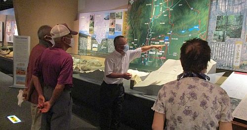 明日、9月20日(日曜日)の午後1時30分より3時まで、博物館の多目的ホールにおいて、今年度の1回目(通算10回目)の館長講座が予定されています。よろしければお出かけください。 そうそう、内容は、ないよう。いやちがう、金山遺跡の周辺に見られる炭焼窯の遺構について、これまでの情報とこれからの課題などについてのお話しです。金を精錬するのには、1000度以上の高熱が必要、その熱源を考えるとき、炭の問題は欠かせない、そういうことをベースにした考古学的なお話しです。 写真は、昨日の町民ウィークにちなんでの常設展示のご案内の場面でした。
