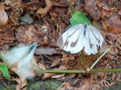 博物館の建物の裏手で見られた光景です。メスのスジグロシロチョウが、ツユクサの葉の上にとまっていたところ(画面右手)、背後からオスのスジグロシロチョウが急接近。この後は、つかず離れずの時間、求愛行動が見られました。彼らは幼虫で冬越しをするということで、秋に入って、産卵し孵化し幼虫になり、そして来春を迎える、そうした営みが垣間見られました。