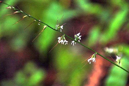 博物館の裏手の山陰の暗い環境に、チジミザサの花が見られました。 花と言っても、チジミザサの場合、イネ科チジミザサ属の多年草なので、イネの仲間と同じような、花びらのないものになります。