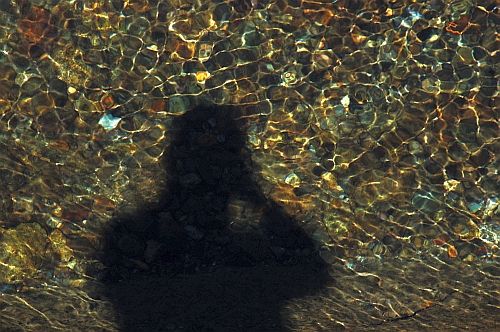 お日さま背に、下部川の流れをのぞき込みました。 あっ、自分の影が川面にうつるようになった。 お日さまの高度が、ここまで下がってきたのだ。 川の流れは、おだやかで、澄みきっている。 お日さまの光が、川底までとどき、水面の波による屈折模様が 川底に不思議な模様を描いている・・・。