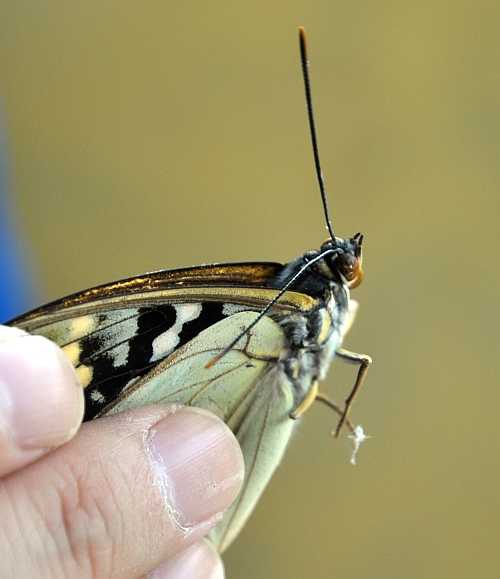 館内に迷い込み、身動きできない状態になっていたオオムラサキです。ちょっとお疲れになったみたいで、お外に出ていただいても、すぐには飛び立てないようすでしたが、ともかくお里にお帰りいただきました。次に入館されたら、チケット代とるよう~、って。
