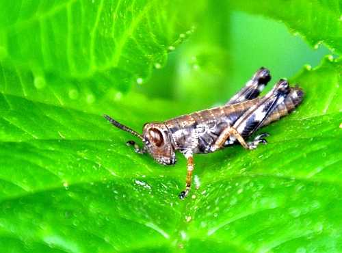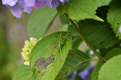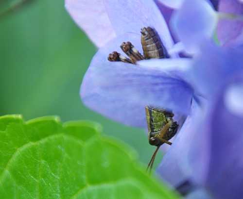 だいぶ大きくなってきましたが、まだ幼虫段階、バッタの若者です。アジサイの花の中に、ジッと潜むようにしていました。 正面から撮ったつもりでしたが、逆さま・・・。 2つめの写真、何となく落ち着かないので180度回転してみました。まだ翅が未発達ですね。いい大人になるんだよ。