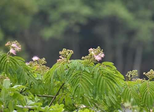 そろそろかな、と思ってあしをのばすと、咲きはじめていました。ネムノキの花です。梅雨の頃に、あちこちで見られるのですが、当地では、下部リバーサイドパークの上流側の外れに見られます。 下部川にせり出すようにあるネムノキの、やや背の高い木の頂付近に見られるので、川風にゆられていて、この写真、ブレてしまっています。 金山博物館へのアクセス道路のうちの温泉橋の上からの、下流側(博物館側)の眺めですが、薄いネムの花色の円で示したところに、今回のネムノキはあります。