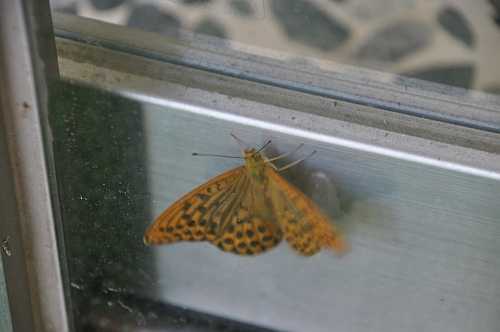 数日前のこと、博物館の正面玄関のドア(引き戸)の隙間に、ヒョウモンチョウの仲間が1頭、迷い込んでいました。おやおや、どうしてそんなところに・・・。 ガラス戸の隙間でも、少しは動きがとれるようで、向きが変わりました。たっ、助けてくれ~。SOSが聞かれました。ので・・・。 何とか救出、そして館外に出て、解放したところ、空高く飛び去っていきました。別に恩返しは期待していませんから・・・。それよりお元気で ミドリヒョウモンさん!