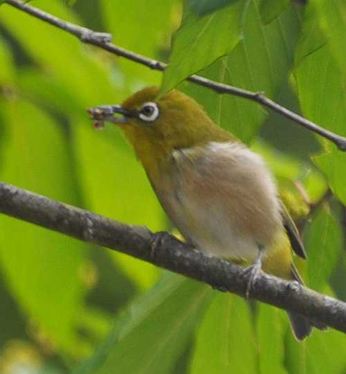 メジロのお母さん(お父さんかも、でも以下はすべてお母さんとします)、木の枝にいて、何か不安げにあたりに注意を払っています。口に何かくわえながら。 メジロのお母さんがいたのは、花の時期を迎えているヨコグラノキの小枝でした。体をのりだすようにして、木の下の方を見ていました。何があるのかしら・・・。 お母さんメジロの視線の先にいたのは、こちら。巣からはいだしたばかり、という感じのメジロのおさなごです。しばらく眺めていてわかったことですが、まだ、うまく飛べません。 お母さんメジロは、幼鳥の近くにいて、やさしく見守っていたのでした。 こんな距離感でした。この後、親子の追跡をやめてしまったのですが、後で同じ親子を目撃した博物館スタッフの話によると、子どもがアオダイショウに狙われたようだけど、親鳥が果敢に子どもを守る行動をしてたそうです。 何とか、無事に成長できるといいな。