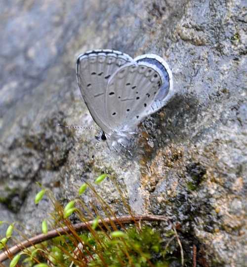 ルリシジミは、その翅の表側の色が、その名をあらわして瑠璃色をしているのですが、なかなかそこは見せてくれません。 写真は、先日、雨が表面をつたう石の上にいて、管状の口をのばし、補水している場面でありました。チョウの仲間は、元気よく飛び回るためのエネルギーがけっこう必要だそうです。とくにミネラル分のある水を吸って、それを力にすると聞いたことがあります。ルリシジミも元気に飛び回れるよう補水を行っているんだな、と眺めている時間がありました。