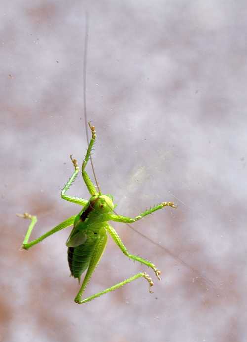 前回取り上げたキリギリスの仲間の若者ですが、時に博物館の建物のガラスにはりついていることもあります。
