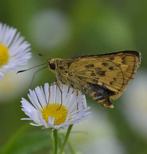 ヒメジョオンの花で吸蜜しているキマダラセセリを見ました。 セセリチョウが翅を開くことは、やや貴重なので、後ろに回っての撮影です。でも、なんか真後ろすぎたかな。 ちょっと斜め横後ろからお姿拝見でありました。