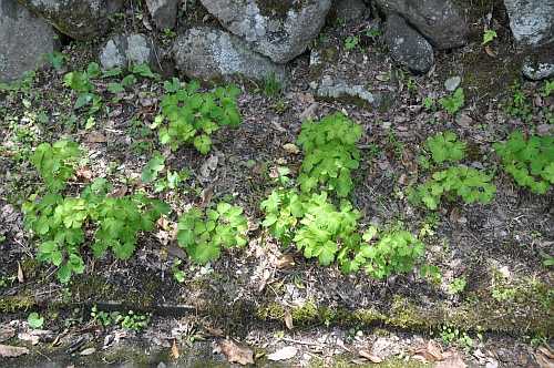 博物館の前庭の南に接続するお山の、山裾部分に毎年オダマキが生えて、花を咲かせています。でも、今年は、5月に行われた博物館周辺の除草管理の作業によって、地表すれすれから上を刈り取られていました。 それがいま、ここまで復活してきたのです。たいへんな生命力です。 茎が伸び、葉が広がっただけではありません。花さえ咲くようになってきたのです。すごいぞオダマキくん。
