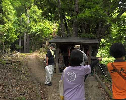 ご存知、『みすきちゃんと行こう 身延町の文化財ガイド』です。町の教育委員会から2007年に刊行されていたものです。とっても便利で役に立つ本ですが、その中に、前々回の話題である湯之奥の山神社に関係する「湯之奥群生ウラジロガシ」についての説明が出ています(p.225)。そして・・・、 そのページの右下隅に、注目の記述が見られました。ここでいう「ここから」というのは、山神社の参道付近からということで、社のある尾根を、拝殿や本殿を横目にしながら、さらに上がって行くと、「願掛け地蔵」があるというのです。 で、実際にそのとおりに歩みを進めると、願掛け地蔵さんの祠の前に出ました。この湯之奥集落の訪問のときに、何くれとご案内をいただいた町の文化財の先達からうかがうことができたお話しでは、もともと金山のあったお山の中に祀られていたのだそうで、それが少し前の時代になって、この地に降ろされてきたものだそうです。 湯之奥金山遺跡群と結びついていた湯之奥集落をめぐる信仰世界の奥行きを感じさせてくれるものだな、と思われました。 それから、今になって思うのですが、「コロナが一日も早く収束し、再びの安寧がもどりますように!」って、お願いしてくればよかったのにな。うっかりでした。