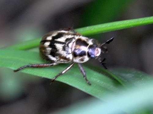 博物館のお隣の下部リバーサイドパークの最下流部は、すぐにお山に続いています。そんな場所の草原の中で、草の葉の上にいた小さなコガネムシの仲間を見つけました。 観察の時刻は、17時。梅雨時で西寄りにお山が控える環境では、だいぶ暗くなっていて、せっかくの虫さんとの遭遇も、うまく撮りきれませんでした (;。;)。 で、このこのお名前は、セマダラコガネ。 背中が黒と褐色の斑模様になっているのが外見上の特徴で、もう一つ、触角の形がくしみたいになっている、とネット図鑑に紹介がありました。これで体調が1cmくらいとコガネムシの仲間では、小さめなものです。かわいいね。