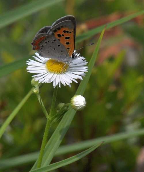 シジミチョウの仲間で、オレンジがかった翅色のベニシジミです。ヒメジョオンの花の上にいるのを見つけ、写真で確認すると、吸蜜をしているのでありました。