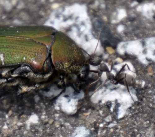 博物館の前庭の舗装面の一画で、アリとコアオハナムグリのバトルが見られました、・・・ではなく、 コアオハナムグリの死骸を1匹のアリが、せっせと運んでいる場面でありました。自分の体の何倍もあるのを、後ろ向きに引っ張っていたのです。 ごちそうであるコアオハナムグリの体の、頭の部分を、アゴでしっかりとホールドして、自分の巣の方向に移動させているのでした。すごぉ~い。