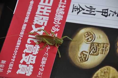当館のミュージアムショップのレジ脇の目立つところに、初代館長・谷口一夫先生のご著書が平積みされていますが、その上に1匹のキリギリスの仲間の若者が来ていました。それがおもしろおかしく感じられたので、ご紹介です。 曰く、これが甲州金なんだね、すごいね。 この漢字、たしか「きん(金)」っていうんだよね。 とっても学習意欲旺盛なキリギリスさんでした。