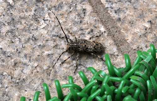 博物館のサブエントランスの足ふきマットの直ぐわきに、小さな、それでも先のセマダラコガネより少し大きい、甲虫の1種が見られました。なんだろう・・・。 こちらは、ナガゴマフカミキリ、すなわちカミキリ虫のなかまの、小さなヤツだと見ることができました。 もうすぐ夏休み、身近なところにも自然観察(自由研究)の入口が、たくさんあることに気づかされます。まわりに目を見はり、耳をそばだてて、不思議の世界にチャレンジしましょう。