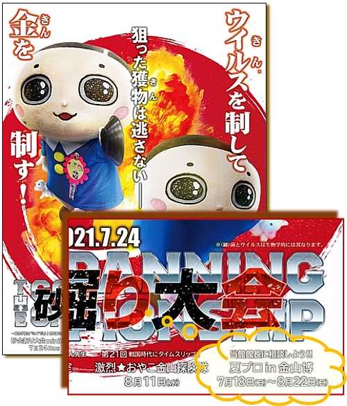 ただ今、博物館のエントランスホールで、来館者受付をローアングルで見ると、このように夏イベントのポスターが連続で張り出されています。 その同じデザインがチラシにもなって配布され、また博物館のホームページにも掲載されています。 その内のメインイベントは、『砂金掘り大会ミニ 2021』です。その開催、まだまだ先かと思っていたら、もう次の土曜日に迫ってきています。 大会名に「ミニ」が付くのは昨年から。それというのも、人が集まることがはばかられる、あのにくきパンデミック、COVID-19のおかげです。 できるだけ創意工夫して、安全安心のうちに伝統あるこの大会をなしとげたい、そのための「ミニ」なのであります。 多くの関係の皆さま、この夏もどうぞよろしくお願いします。