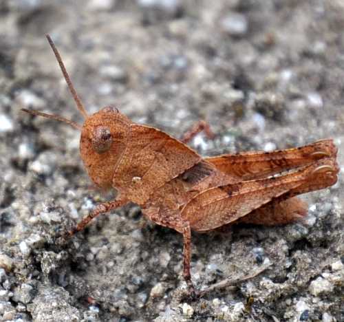 まだ幼虫段階の、小さなバッタの仲間が、下部リバーサイドパークのボールコートの一画で見られました。 別なカットで、お顔だけ切り出してみました。若々しいお顔でした。 とてもしつこく追いかけ回し10数カットも撮影しましたが、その中で上からの写真です。 そして正面顔・・・。 ここまで見てきて、肝心なそのお名前ですが、はじめヤマトマダラバッタの幼虫かと思いましたが、調べ直すとヤマトマダラバッタは、絶滅危惧種で、なかなかその姿を見るのは難しいみたい。そこで、次に考えられたのは、成虫もよく見られるクルマバッタモドキ。たぶん、その幼虫でよいのではないかと思われました。 ちなみに、大人のクルマバッタモドキの、当地での観察例の主なものとして、次のようになっています。1)「もう一度、クルマバッタモドキ」 2020年9月17日 2)「緑型のクルマバッタモドキ」 2020年8月23日3)「クルマバッタモドキ」 2020年8月20日