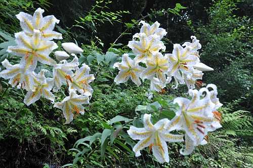 博物館のすぐ山側に見られるヤマユリですが、先日(7月6日)、最初の開花を取り上げました。それが今はもうこんなに賑やかになっています。 つぼみのまだありますね。 最初の開花の観察の時、花粉の袋のことにふれましたが、左下が開花直後で、右上の方が数日たっているものです。すこしずつ変化があるヤマユリでした。