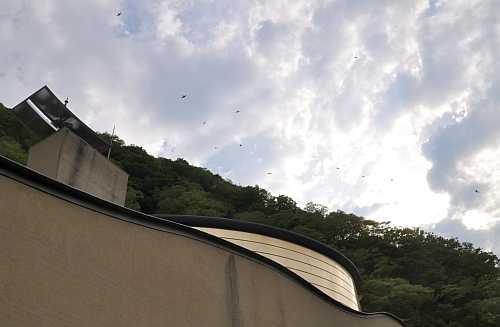 午後の後半になるころ、博物館の周りにはたくさんのツバメが群れるようになります。この写真では、小さくてわかりにくいかと思われますが、昨日(7/29)の夕方の曇り空を背景にした小さな黒い点に見えるのがそれです。 そのツバメたちは、基本的には、小さな虫などのエサ取りに励んでいるようですが、時々、博物館の建物の外壁にとまったりしています。 それも、時にけっこうな数になります。眺めていると、見飽きない・・・。(初回投稿:2021年7月30日09時58分 加筆投稿:7月30日17時48分)