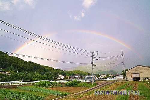 7月14日の水曜日、湯之奥金山博物館は「休館日」でした。当ブログの運営の都合(ネット接続機器の不調)で、いつもながらのお知らせになりませんでした。 そんな日の夕方、夕立が来て、ザッと降ったなかで、ご覧のような虹が見られたのでした。その時点では、大きな虹、きれい、くらいにしか見ませんでしたが、後でPCで画像補正を行う中で、二重の虹であったことが確認されました。
