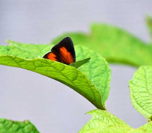 カシワバアジサイの葉の上に、ウラギンシジミがとまりました。 シジミチョウ科のチョウの中でも、やや大型のウラギンシジミは、とても活発でいつも元気にとんでいて、とまる場面は少ないのですが、その際も翅をたたんでいて、いつも銀色の裏側を見ることが多いのです。だから、こうして表側の鮮やかな色を見られるのはレアなこと、やったーっていう感じです。