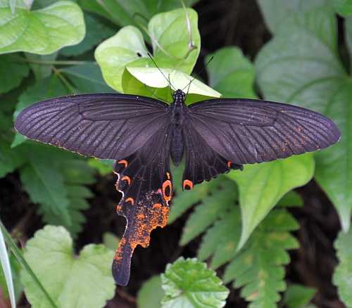博物館の前庭の南側に接続するお山の麓で、ツル草の葉にとまっていたアゲハチョウの仲間を見ました。右側の後翅の半分近くを欠いてしまっている個体でした。痛みのない左側の後翅には、ヤマユリの花粉でしょうか、オレンジの粉まみれになっていました。はじめはクロアゲハかと思いましたが、スワローテイルがとても大きいので、また前翅もやや長めなので、オナガアゲハでよいかと思いました。