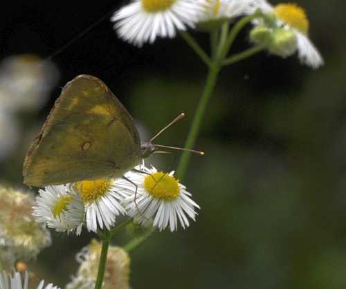 モンキチョウが、下部リバーサイドパークの傍らに咲くヒメジョオンの花にやってきて吸蜜していました。 時々に花をかえて、蜜をもとめつづけているのでした。