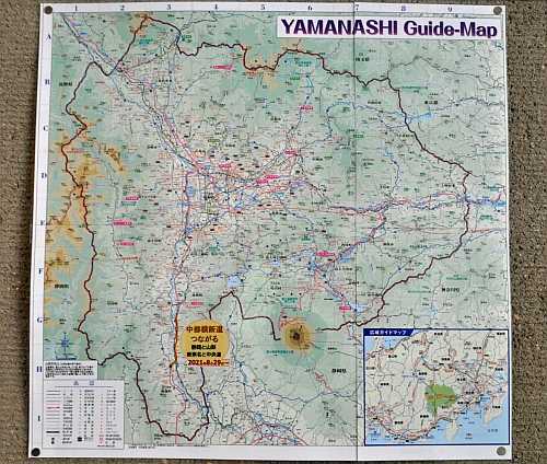 博物館のエントランスホールの壁面に、昨日、この山梨県のガイドマップが張り出されました。 県の観光推進機構によるマップで、このほどいただいたものですが、注目点は、館独自の情報の貼りつけがあるところです。それは・・・。 すでに報道発表もありましたが、今年8月の終わり(29日・日曜日)に、中部横断自動車道の長坂以南の区間が全線開通するということで、「中部横断道 つながる」の表示が貼り加えられているものでした。 もうすぐですね、待ち遠しい。沿線の関係の準備は大丈夫かなぁ・・・・・。
